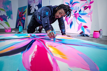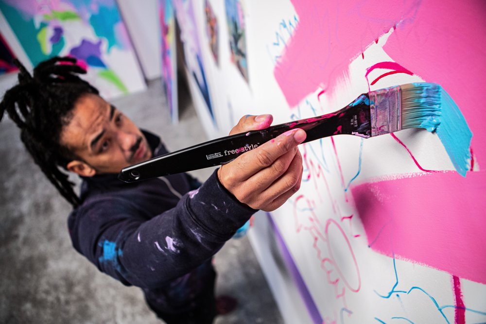 Tim’s oversized canvases overwhelm the viewer with striking compositions in a distinctive signature color palette of vibrating pinks, electric greens and vivid blues. He uses a variety of techniques and materials including wet paints, inks and spray paint, applied using brushes, different aperture caps and marker paint mops to orchestrate purposeful marks, strokes, drips, scrapes and smears across the canvas.