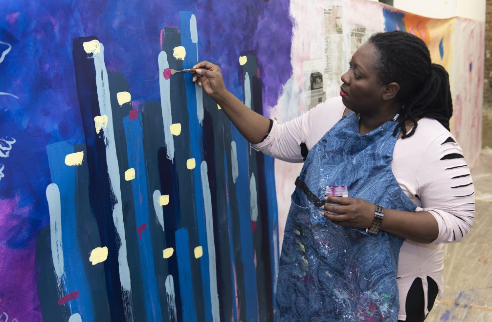After an extensive submission process, second year BA Fine Art student Sarah Savage from UAL Camberwell College of Arts and UAL Central Saint Martins BA Fine Art graduate Alice Bajaj were chosen. Sarah’s mural took over the entrance to the school with concept inspired by landscapes, travel, and the juxtaposition between freedom and restriction. Her mural featured a variety of Liquitex colors and mediums, including Modeling Paste and pro effects mediums. Alice married silhouette motifs of the people seen around the college building and surrounding areas, symbolizing different identities and styles of the students, staff and members of the public that circulate. She used Louise Bourgeois’ Maman and Kathy Acker’s pseudonym of The Black Tarantula as inspiration, exploring the symbolism of the spider in the history of feminist art.