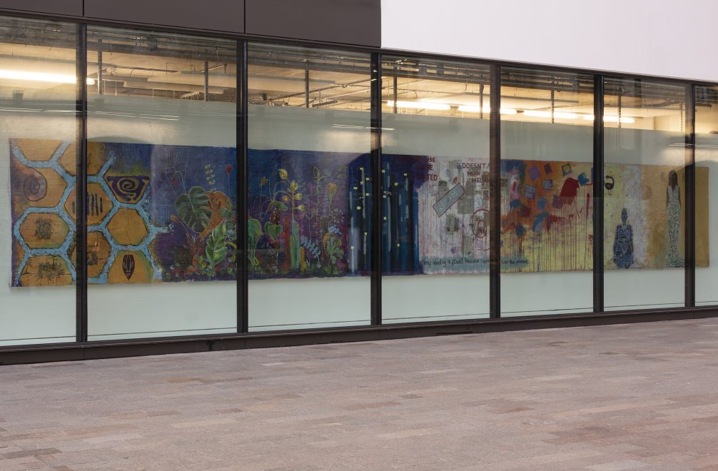 Two pieces of public art. Two historic art schools. The undergraduate artists selected to bring their installations to life for 2022 were Ffi Farrer-Miles, a final year BA Fine Art student at UAL Camberwell College of Arts, and Manyi Takor, a first-year BA (Hons) Fine Art student at UAL Central Saint Martins. Ffi’s work explores the idea of conservation, aesthetic and color chemistry through abstract geometric painting. Taking inspiration from the British architect Maurice Bingham Adams, her installation celebrates the stained-glass windows of the Victorian part of the college. By bringing this original feature into the modern part of the building, the piece creates a dialogue between the traditional and contemporary. Manyi’s piece, Hidden Identities, connects to a long tradition of fresco and mural painting. It asks the audience to consider what acceptance and equity really mean in a space where expected and acceptable values are incongruent with the ego.