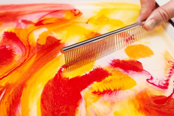 Swirl. Gently swirl the ink pools with a tool until you get a design you like. Knives, metal combs and stirrers will give you different effects.