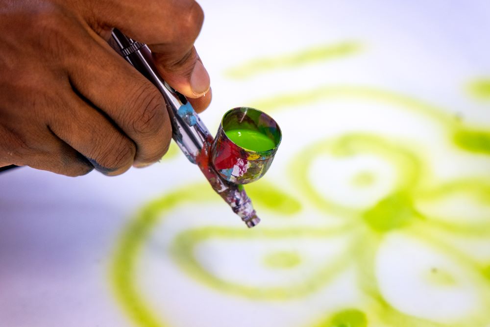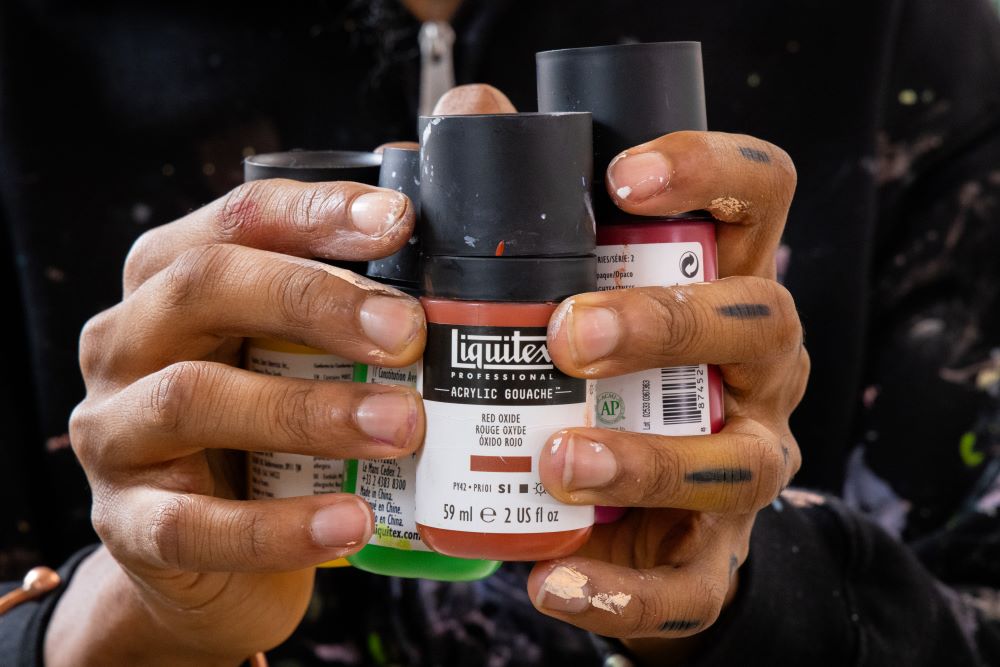 Spurred on by the Liquitex theme of Just Imagine, Jakada approached his residency with “the idea of wonder and just allowing myself to just go at it and explore new mediums, new styles and new sizes of my work.” His intention was to push his Liquitex stocks to their furthest extent. “My favorites have definitely been the Acrylic Gouache. I’ve loved using them from start to finish. I take Liquitex Gesso and add Acrylic Gouache to give it a tint and I use that as my base layer. I use them for detailing, when building layers and building colors to create depth. They’re really bright, very vibrant and just an overall 10 out of 10 product to use.”