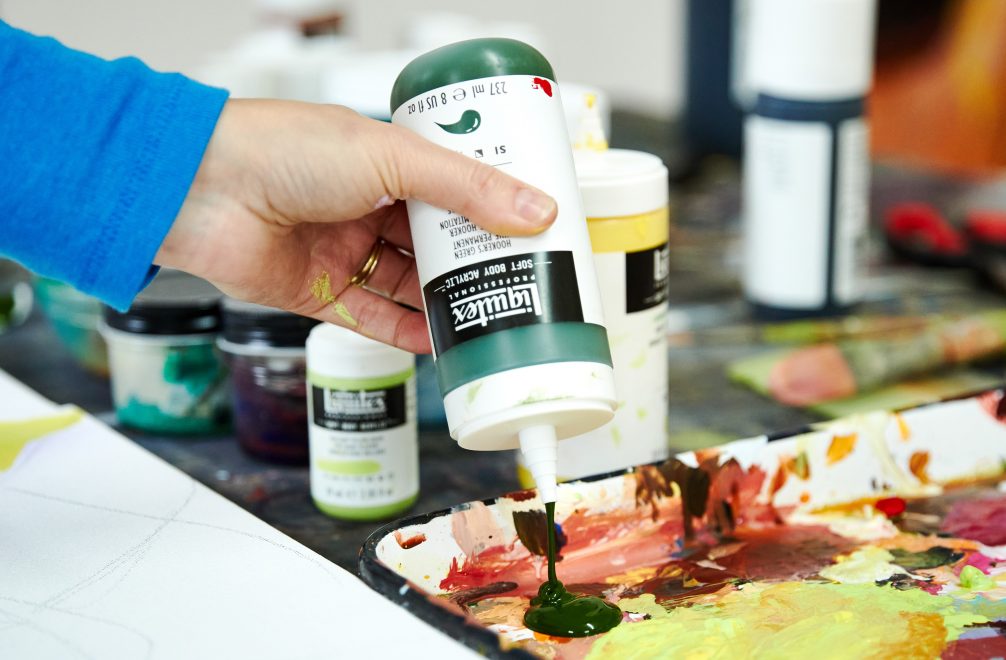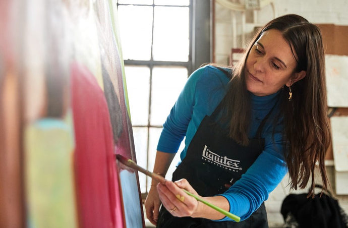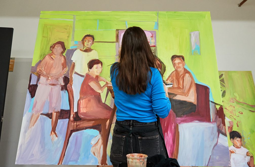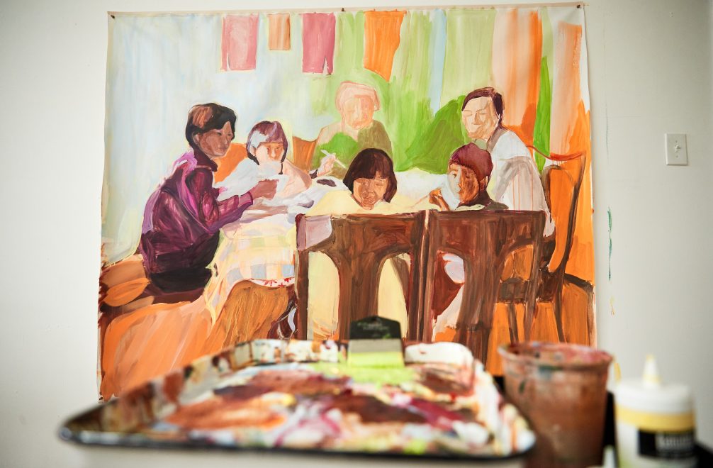 Meet Matilda. Painter, creative, and preserver of heritage and memories. During her Soft Body Acrylic residency, Matilda worked with fluid layers of vibrant color, interpreting emotions and experiences around the concept of immigration in both her and her husband’s families. The result was striking, large-scale reimaginings of family portraits and moments lost in time:
