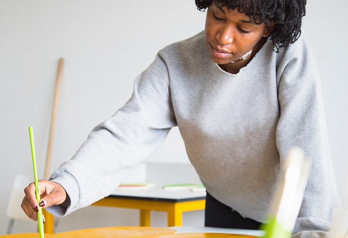 Tschabalala Self describes her current work as “exploring the emotional, physical and psychological impact of the black female body.” Showcasing an eclectic blend of colors and textiles, Tschabalala's thought-provoking work has featured at solo exhibitions in Rome and London. During her Liquitex Cadmium-Free Research Residency at the Griffin Gallery Studios in London, Tschabalala worked on a large-scale mural for a local charity called Hospital Rooms. Using the safer cadmium-free paints was extremely important to Tschabalala, because she knew her mural would eventually end up in a health facility used by adolescents. Discover how she used our materials during her residency here.
