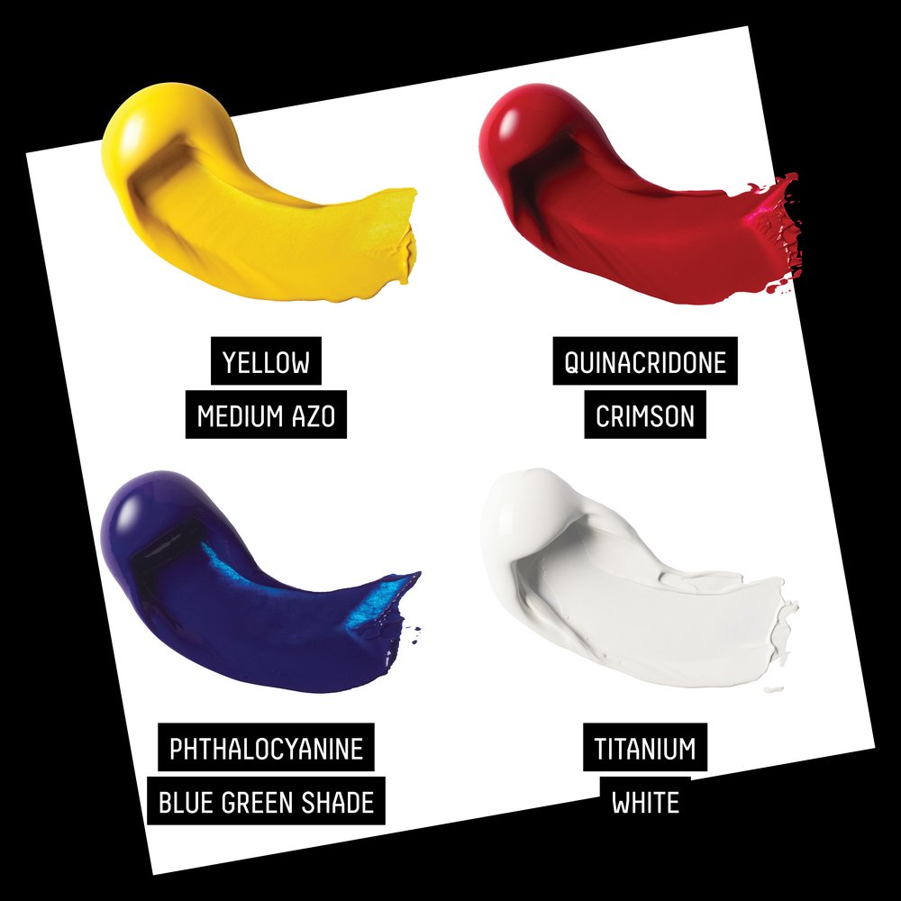 | Set Contents: | 4 x 59ml Professional Heavy Body Acrylic - Quinacridone Crimson, Yellow Medium Az, Phthalocyanine Blue Green Shade, Titanium White |