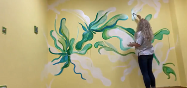 Rebecca tells us more “I really believe in the connection between mental health and exercise, so I was thrilled when I was invited to do this. Water Dance was based on the overwhelming request to bring the outdoors in and make it feel like there was some of the natural world in their environment. The themes reflect the lack of access to large open spaces and considers the way the natural world is also in a struggle to survive and adjust to a changing climate. The plant life depicted is based on images of fauna that are under threat but managing to adjust and thrive. I used multi layers of green and yellow Acrylic Ink as I wanted gestural, fluid forms that seem to be coming to life.