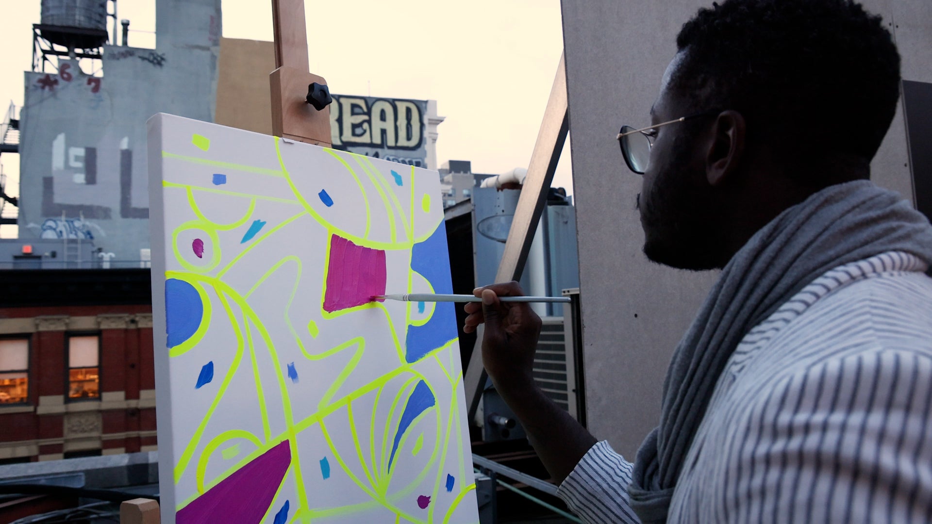 Graphic, dynamic and emitting the unique energy of the city, Eve’s piece asks, “What will you create?” The artist regularly works across multi disciplines and mediums, painting here with the vibrant, pigment-rich colors of Liquitex Bio-Based Heavy Acrylic. In her practice, she explores the emotional power of color, texture, and form and is drawn to investigating nostalgia and intimacy. “I’m always questioning… What are the colors of grief? What is the texture of joy? What shapes are symbolic of home?”