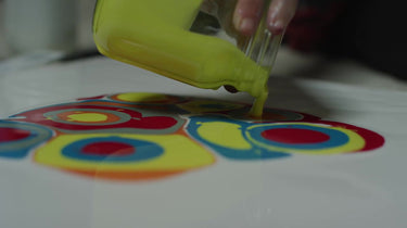 Want more control over your pour? With a matte puddle pour you can achieve natural-looking organic effects with some precision. Here we use Liquitex Basics with Pro Matte Pouring Medium to create perfect puddles of flat color. First coat your painting surface with pouring medium to give an extra cushion, then pour your pre-prepared medium/colors mixes. Watch the pools expand and settle as you pour fresh colors wet on wet into their centers. Add a further layer of pouring medium around the edge and experiment with tools and tilts.