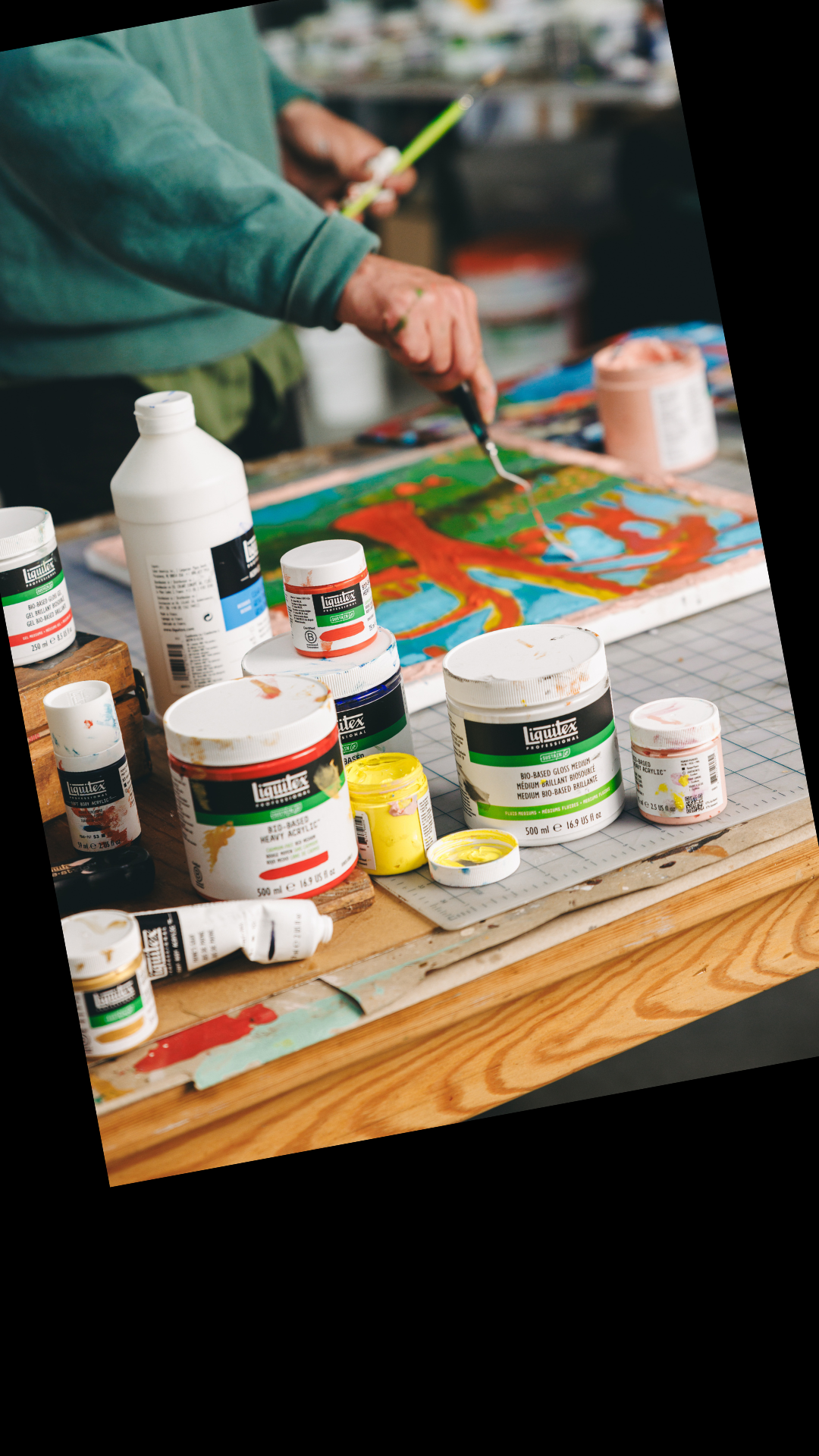 Let’s dive in. The resin base of a typical pro acrylic paint is made from 100% petrol-derived ingredients sourced from fossil fuels and other non-renewable substances. For Liquitex Bio-Based we’ve halved this, replacing ingredients with ones from renewable, biological sources. These come from living or once-living organisms like corn, soy, sugarcane and algae which can be regrown or replenished relatively quickly through natural or farming processes.