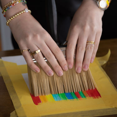 To clean your brushes, wipe excess paint, rinse in water (avoid pressing the filaments), wash with hand soap and water, rinse, reshape, and leave to dry. When cleaning your brushes, it's best to avoid soaking brushes above the ferrule as this can cause the wood of the handle to swell and possibly crack.